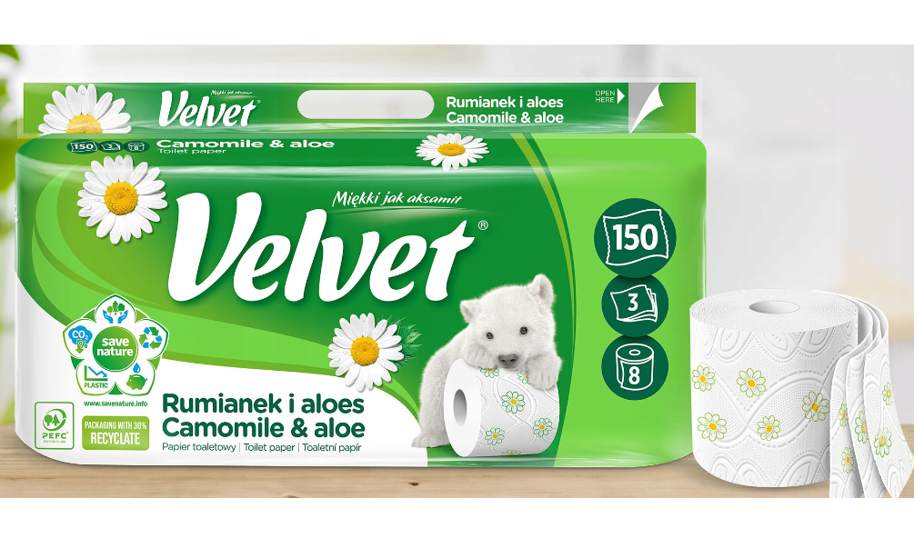 Papier toaletowy Velvet Rumianek i Aloes, wykonany z trzech warstw delikatnej bibułki, jest miękki i ma łagodny, inspirowany naturą zapach. Dzięki eleganckim tłoczeniom oraz nadrukowi stanowi też idealną dekorację Twojej łazienki. Velvet Rumianek i Aloes – higiena i dekoracja inspirowana naturą. Liczba listków: 150 Długość rolki: 18,3m Liczba warstw papieru w rolce: 3 warstwy Liczba rolek w opakowaniu: 8 Surowiec: 100% celuloza
