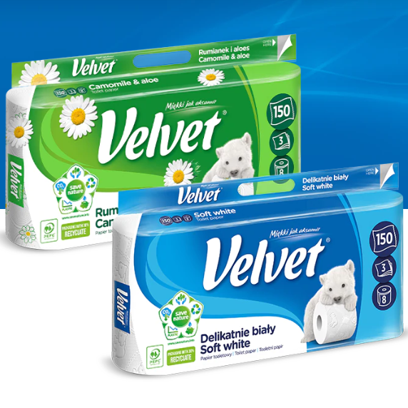 Velvet Delikatnie Biały Papier toaletowy Velvet Delikatnie Biały to trzy warstwy miękkiej bibułki połączonej delikatnym, tłoczonym wzorem z postaciami niedźwiadków. Każdy listek to optymalne połączenie wytrzymałości i aksamitnej miękkości papieru Velvet Liczba listków: 150 Długość rolki: 18,3m Liczba warstw papieru w rolce: 3 warstwy Liczba rolek w opakowaniu: 8 Surowiec: 100% celuloza