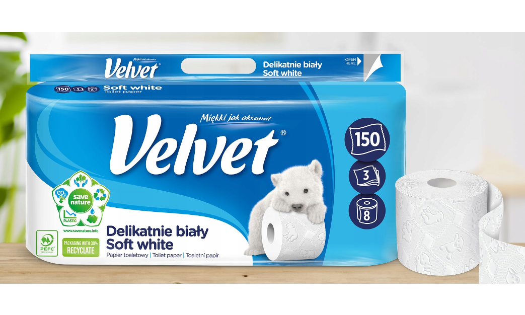 Velvet Delikatnie Biały Papier toaletowy Velvet Delikatnie Biały to trzy warstwy miękkiej bibułki połączonej delikatnym, tłoczonym wzorem z postaciami niedźwiadków. Każdy listek to optymalne połączenie wytrzymałości i aksamitnej miękkości papieru Velvet Liczba listków: 150 Długość rolki: 18,3m Liczba warstw papieru w rolce: 3 warstwy Liczba rolek w opakowaniu: 8 Surowiec: 100% celuloza