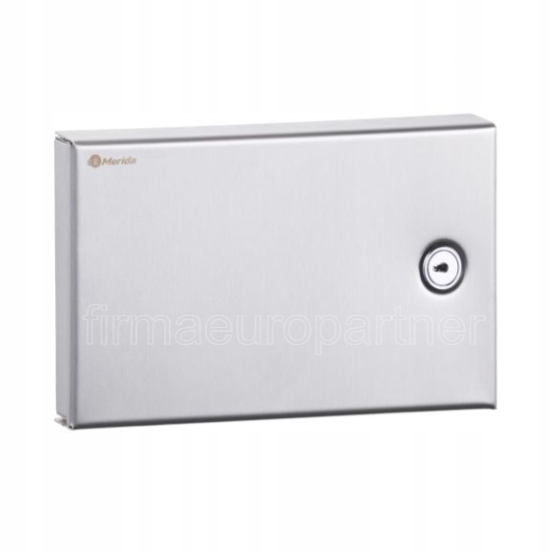 Pojemnik na rękawice foliowe posiada nieduże wymiary. Urządzenie zaopatrzone w haczyk do zawieszenia rękawic. Pojemnik na rękawice foliowe zabezpieczony jest trwałym stalowym zamkiem bębenkowym. Zamek zlicowany z powierzchnią urządzenia. Łączenia boków pojemnika są spawane i szlifowane. Urządzenie posiada niewidoczne zawiasy, obudowa i tylna ścianka wykonana ze stali nierdzewnej.