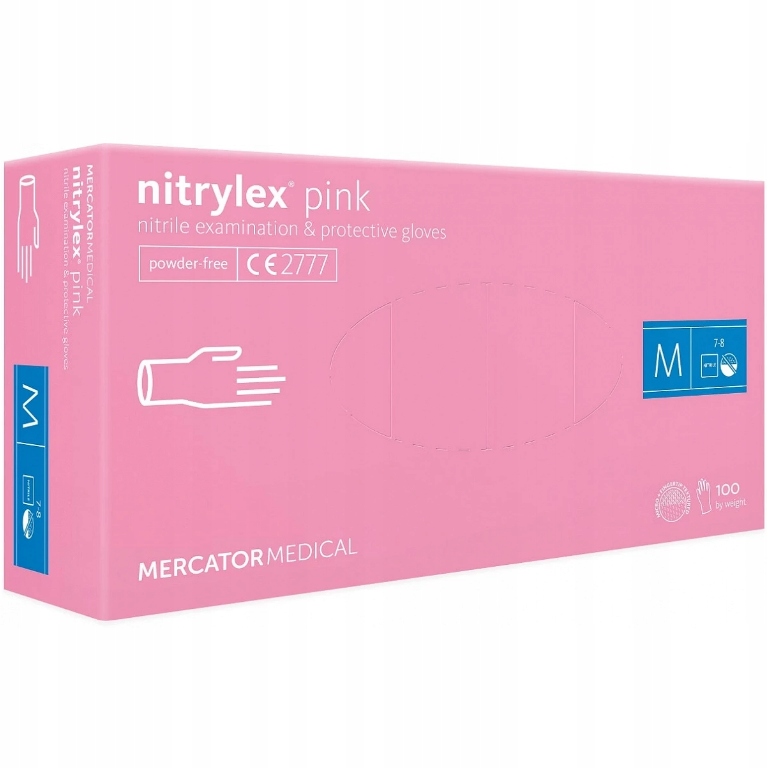 Rękawiczki bezpudrowe, polimeryzowane – warstwa polimerowa umożliwia zakładanie rękawic nawet na wilgotne dłonie. Posiadają kategorię III, co sprawia, że są barierowe dla bakterii, wirusów i grzybów. Rękawice nitrylex® pink są pakowane po 100 sztuk.