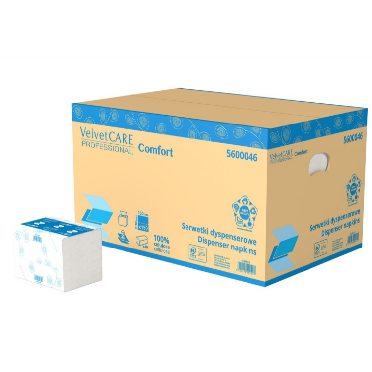 Wysokiej jakości Serwetki dyspenserowe Velvet Comfort, wykonane z celulozy. Wysoka wytrzymałość serwtek zapewnia skuteczne osuszanie rąk, a dwuwarstwowość dużą wchłanialność wody. Specyfikacja: Kod produktu: 5600046 liczba warstw: 2 wymiar listka: W:230 mm, L: 160mm ilość listków: 6000 Ilość bind: 40 surowiec: 100% celuloza Oferta Velvet CARE Professional obejmuje zwijane i składane produkty papierowe wykonane w 100% z celulozy bądź selekcjonowanej makulatury. Swoją jakość zawdzięczają nowoczesnym liniom przetwórczym i wysokogatunkowym surowcom oraz ciągłym inwestycjom w rozwój i innowacje. 120 lat tradycji, wiedzy i doświadczenia zdobytego na rynku konsumenckim, pozwoliło firmie Velvet CARE wkroczyć z kolejną marką w zupełnie nowy obszar działalności, dedykowany szerokiej grupie nabywców instytucjonalnych (przemysł, obiekty użyteczności publicznej). Velvet CARE Professional to połączenie cenionej od lat wysokiej jakości produktów oraz technologii, spełniających oczekiwania nawet najbardziej wymagających klientów.