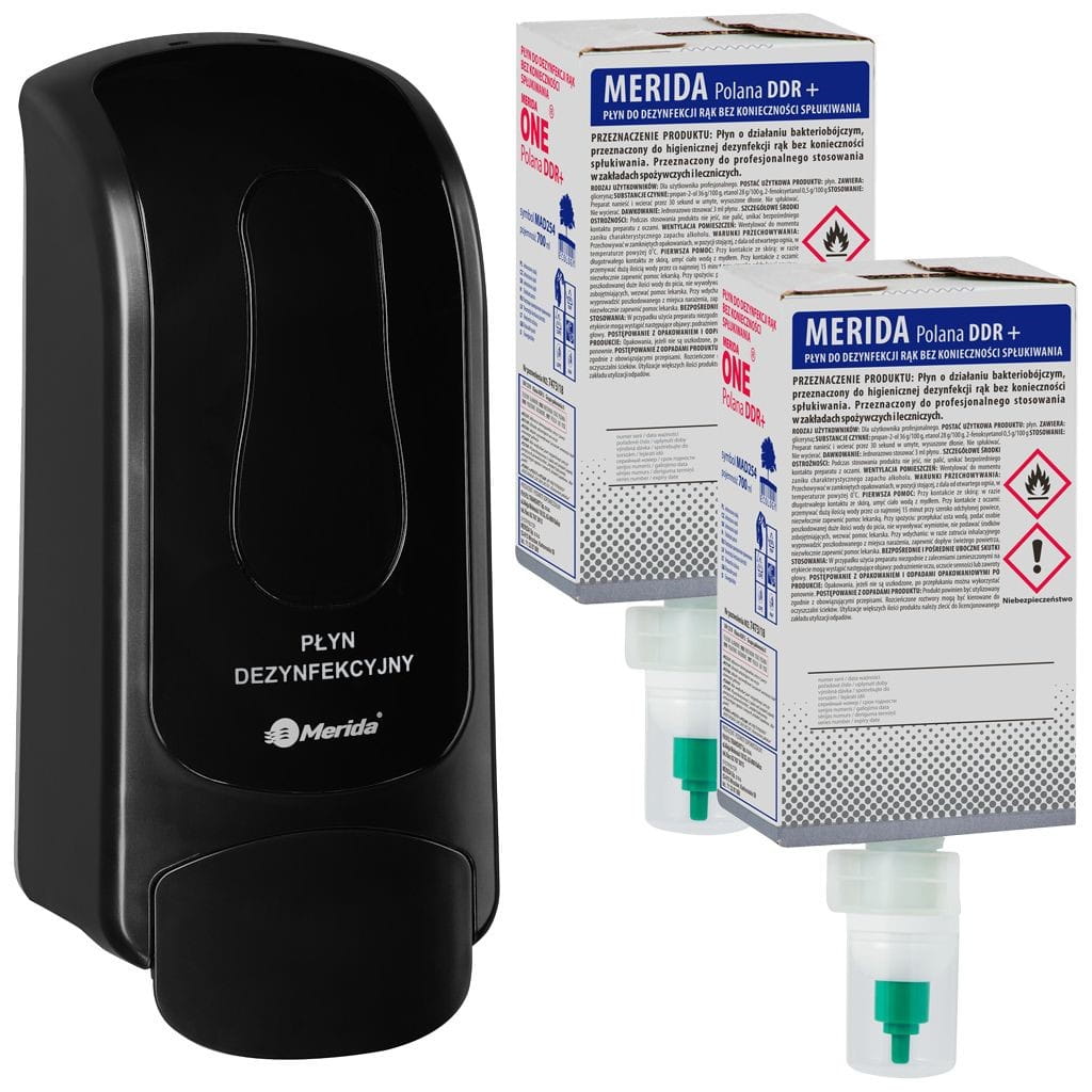 SKŁAD ZESTAWU 1x Dozownik płynu dezynfekcyjnego MERIDA ONE na jednorazowe wkłady 700 ml z płynem dezynfekcyjnym MERIDA POLANA DDR+, tworzywo ABS, biały DEC402 2x Płyn dezynfekcyjny MERIDA POLANA DDR+ do chirurgicznej i higienicznej dezynfekcji rąk, jednorazowy wkład 700 ml z pompką sprayową do dozownika MERIDA ONE MAD254